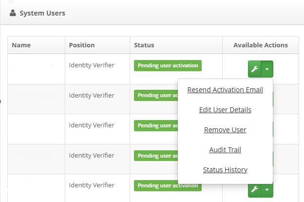 When an approved ID Verifier has not activated their ID Verifier account, their user status will show as 'Pending User Activation'. In this instance, you the activation email can be resent if necessary.
