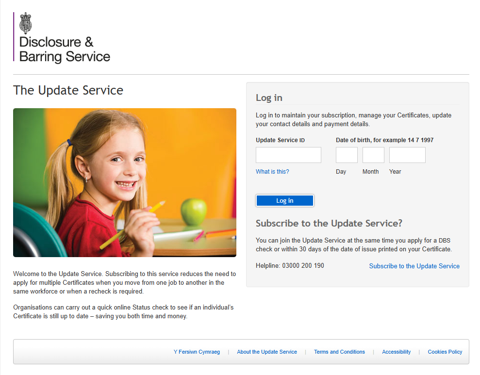 I can’t log into the DBS Update Service or find my Update Service ID number: We can not access your DBS Update Service account as it is registered personally to the account holder with the Disclosure and Barring Service. Please contact the DBS via their helpline: 0300 0200 190 (option 3, then option 2).